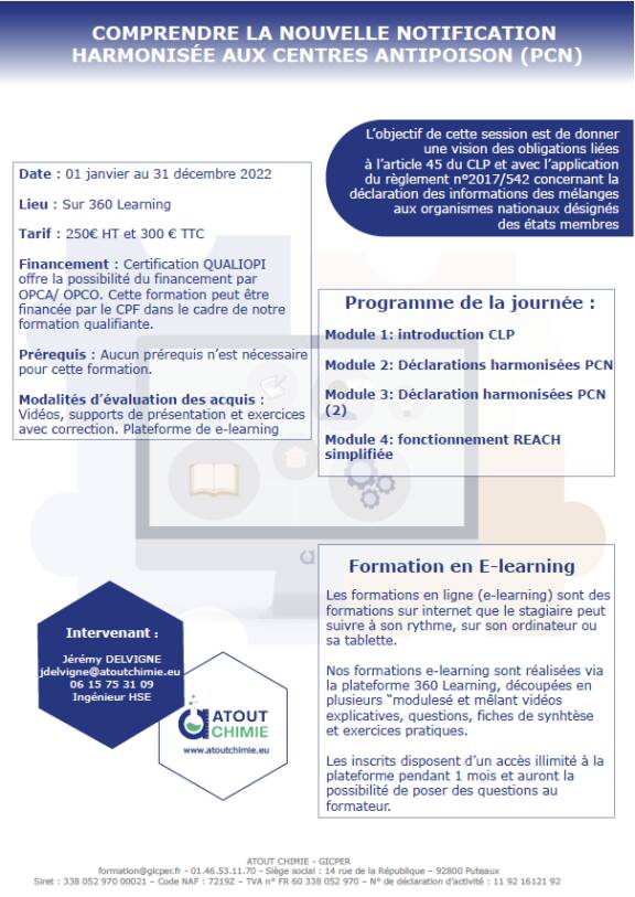 L’objectif de cette formation est de vous expliquer les obligations liées aux nouvelles déclarations harmonisées du CLP concernant certains mélanges dangereux et de vous préparer à utiliser le logiciel IUCLID 6 pour monter vos dossiers.
